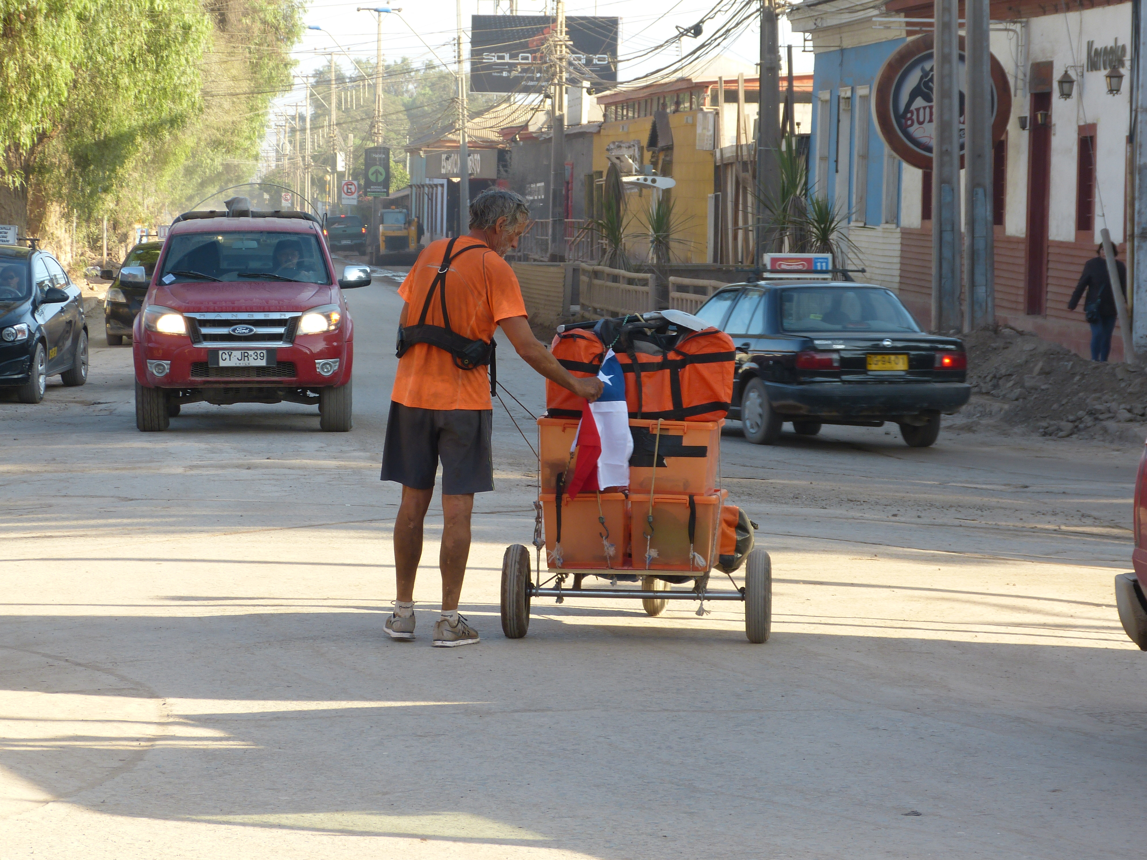 Samedi, en voyant cet homme, barbe blanche et clairsemée, cheveux hirsutes, courir dans les rues de Copiapo, les quelques chiliens croisés n’ont pas compris qu’il tractait plus qu’un chariot. Personne n’a fait attention à son t-shirt orange couvert de poussière. Ni à son nouveau statut.